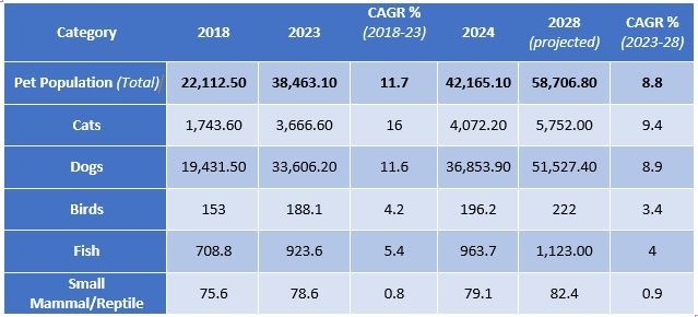 India's pet population has seen remarkable growth, rising from 22.1 million in 2018 to 38.5 million in 2023, registering a CAGR of 11.7%. This upward trend is expected to continue, with the pet population projected to reach 58.7 million by 2028, growing at a CAGR of 8.8%.
