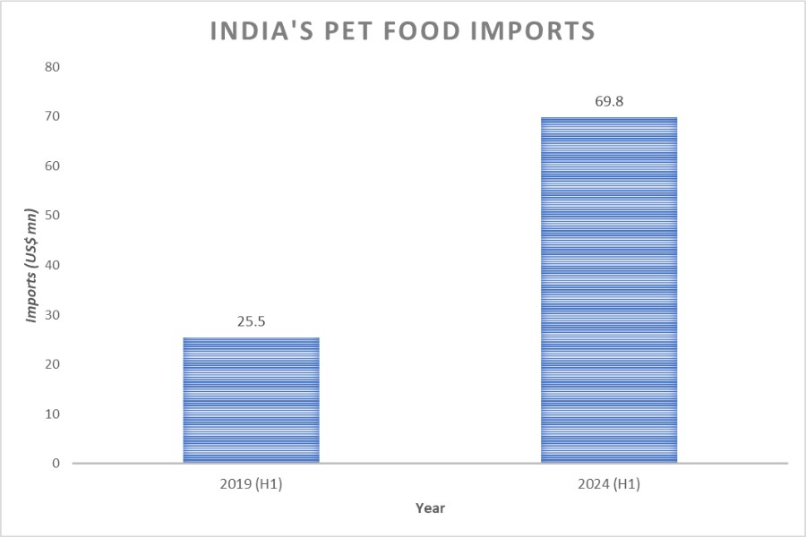 India's imports of dog and cat food have more than doubled over five years — from US$ 25.5 million in the first half of 2019 to US$ 69.8 million in the same period of 2024, according to the Ministry of Commerce and Industry. In fact, imports have surged over sixfold from US$ 11.2 million in H1 2015.
